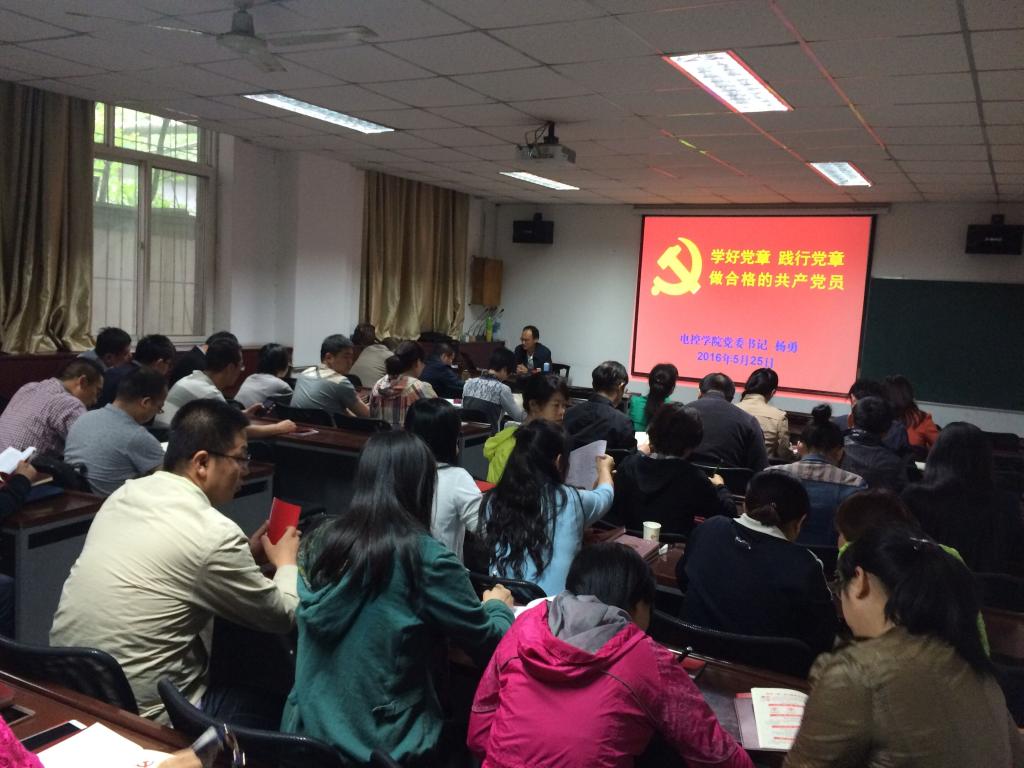 2016年5月25日,在太阳成tyc122cc雁塔校区会议室,党委书记杨勇同志结合自身学习情况,以“学好党章 践行党章 做合格的党员”为主题,为公司全体党员讲授了专题党课,党课从学习党章的重要意义、党章的主要精神和内容以及按照党章要求做合格的共产党员三个方面做了详细的解读和论述。他强调,全体党员要认真学好党章、积极践行党章,坚定理想信念、树立全心全意为人民服务的思想品德和高度自觉的组织纪律,做一名合格的共产党员。