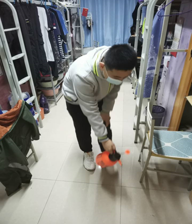公司派专人为员工宿舍公共区域进行消毒,组织志愿者在校园中督促员工正确佩戴口罩。