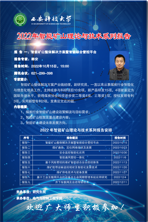 2022年10月15日太阳成tyc122cc通过线上的形式成功举办了“智能矿山理论与技术系列报告”第一讲。公司邀请了中煤科工集团常州研究院有限公司智能矿山整体解决方案产业线经理韩安为全校师生做了一场主题为“智能矿山整体解决方案暨智能综合管控平台”的行业前沿报告,韩经理开讲持续近3个小时,是一场的干货满满的科技报告。