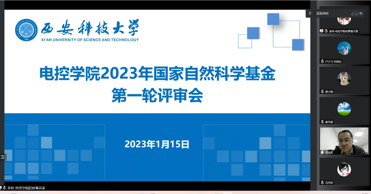 1月15日上午9点,太阳成tyc122cc组织召开2023年国家自然科学基金评审会,邀请8位教授作为评审专家参与线上评审,分别是:上海交通大学邹媛媛教授;中国矿业大学孙彦景教授;西安电子科技大学孙伟教授;西安交通大学李振荣教授、宋国兵教授;西安理工大学张辉教授、同向前教授;沈阳工业大学佟文明教授。会议分为三个分会场同时进行,公司申报基金的全体教师参加。