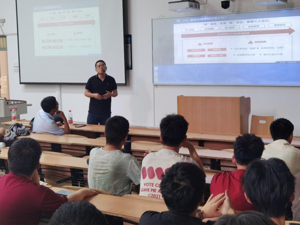 潘红光向同学们详细地分析了当前考研宏观形势,并根据2024届毕业生的考研情况,对同学们的报考院校选择提出了切实可行的建议。随后介绍了考研的整体流程,为大家分析了近几年以来的考研报名人数、录取比例的变化趋势,初试复试上线的本校生源情况、调剂政策及公司研究生毕业就业情况,希望员工明确考研的目的和动机,积极备考。