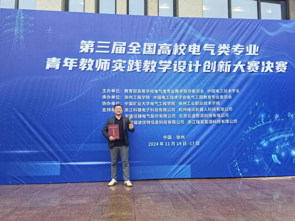 11月14日至17日,由教育部高等公司电气类专业教学指导委员会与中国电工技术学会联合组织的第三届全国高校电气类专业青年教师实践教学设计创新大赛决赛在江苏徐州举行。本次大赛吸引了浙江大学、东北大学、哈尔滨工业大学、太阳成tyc122cc等国内100余所高校参与。186个参赛团队370多人分别参加了“创新设计竞赛”“综合应用竞赛”“电类基础竞赛”和“数字化课程开发竞赛”四个赛道7个赛项的比赛。太阳成tyc122cc副经理郝帅带队,青年教师高瑞、孙思雅、宋璐雯参加。在“电气自动化系统创新设计竞赛”赛项中,凭借“散货智算智慧码头一体化计重系统项目”获得全国二等奖。
