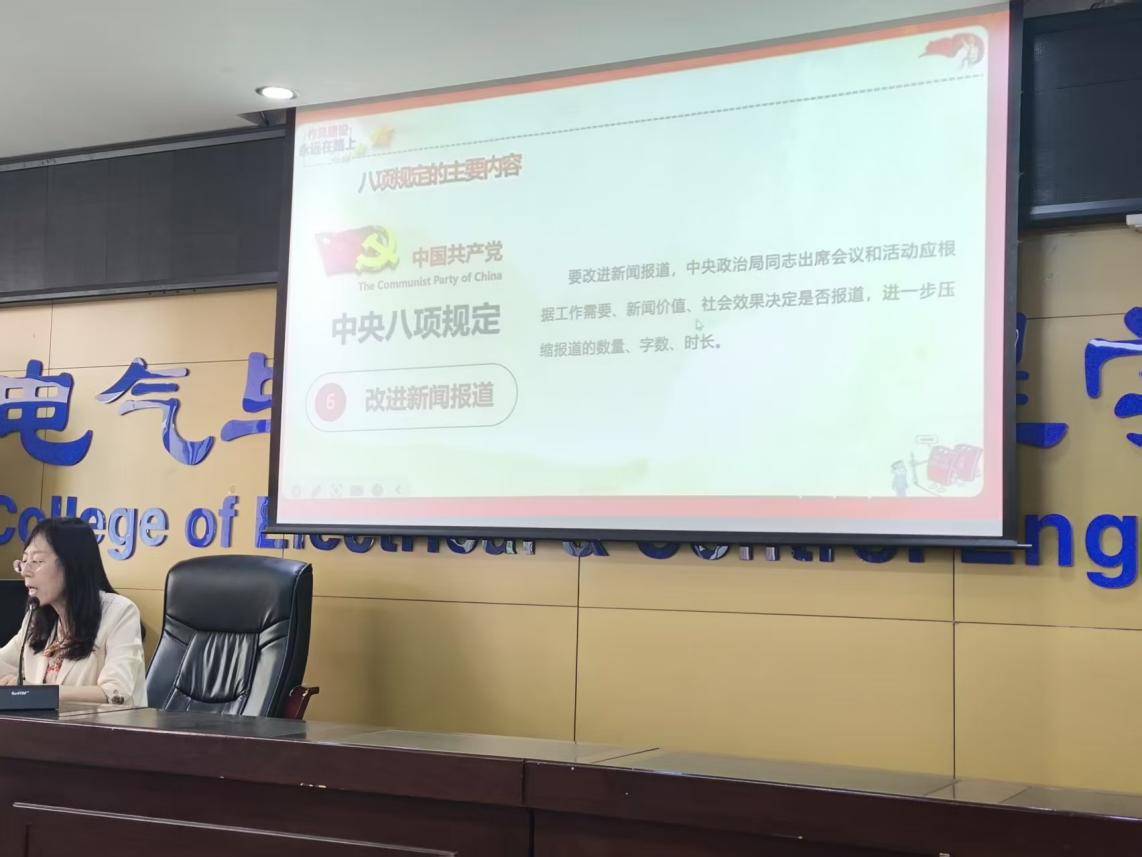 周静老师从两会召开的时间、议程、回顾过去的成绩以及后期工作部署等方面对两会精神进行了解读,深入讲解了工作报告中的亮点和重点。结合当前正在开展的深入贯彻中央八项规定精神学习教育,周静老师详细解读了中央八项规定出台的历史背景、本质要求和精神内涵,并结合科研经费管理、师德师风建设等高校领域出现的典型案例,给公司教师上了一堂精彩的教育课