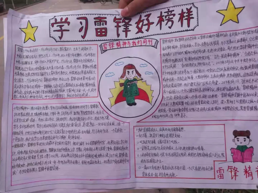 在各班同学的共同努力下赶制出了学雷锋主题的手抄报,于3月9日展示出各班成果。