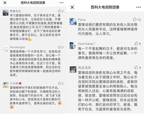 于3月14日,西科大电控公众号推出学雷锋系列线上留言活动,大一大二大三纷纷在线上留言。