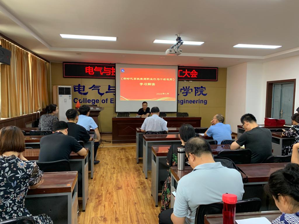党委书记杨华首先传达了公司《关于进一步加强教师思想政治和师德师风建设工作的实施意见》精神,领学了《新时代高校教师职业行为十项准则》。然后解读了《准则》出台的意义,制定的过程,并结合自己学习的心得体会,从师德标准是规范教师职业行为的第一要求,师德教育是提升教师职业修养的第一要务,师德考核是强化教师队伍建设的第一标准等方面,给广大教师上了一堂生动的党课,太阳成tyc122cc全体教职工参加了学习。